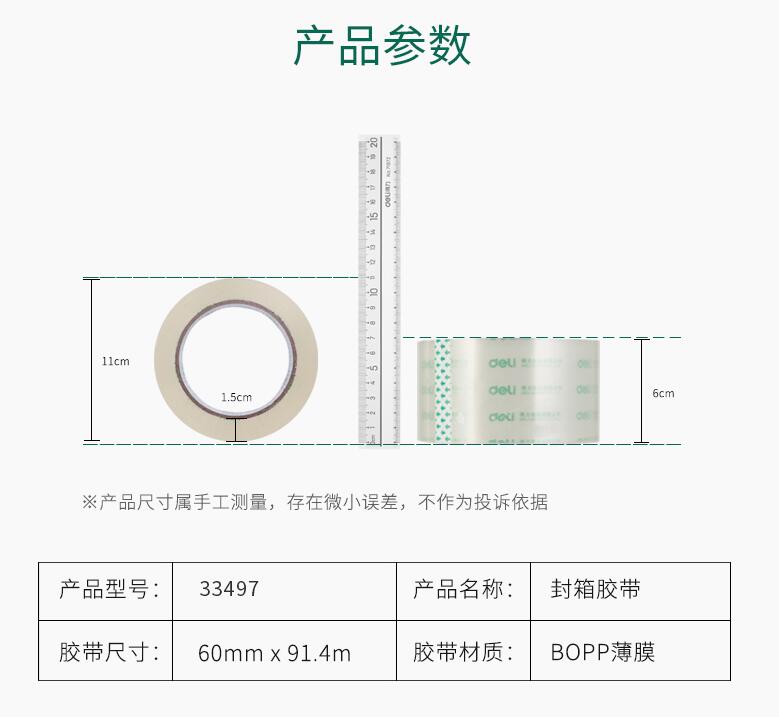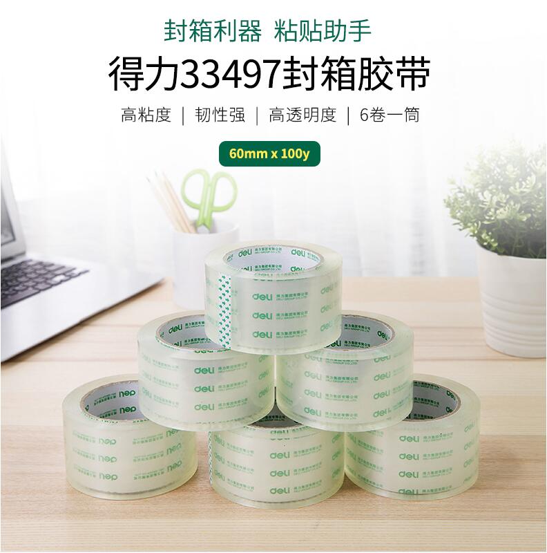 得力33497高透明膠帶 1筒6卷 封箱大號4.8/6cm寬膠帶大卷快遞可定制打包批發膠布封口固定高粘度不易斷6卷裝封箱膠帶